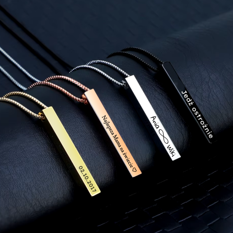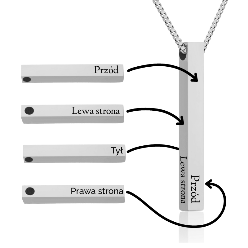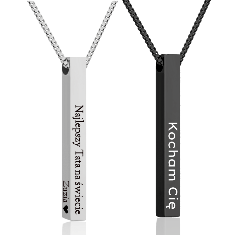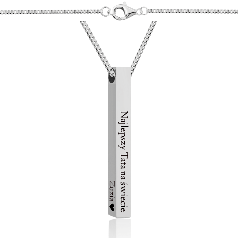 Wisiorek w kształcie słupka ma aż cztery powierzchnie, na których wygrawerujemy wyznanie, imiona, daty, życzenia, lub cokolwiek zechcesz, co wywoła uśmiech na twarzy osoby nim obdarowanej.