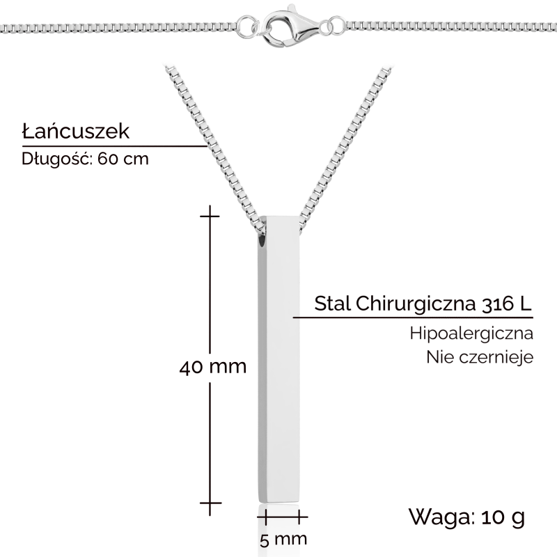 Naszyjnik wykonany jest z hipoalergicznej stali chirurgicznej odpornej na rdzę. Ten wysokiej jakości materiał zapewnia długotrwały połysk i jest szczególnie przyjazny dla skóry. Nie zawiera kadmu, niklu, ołowiu, jest antyalergiczny i nigdy nie blaknie. Niezwykle trwały, dzięki czemu można go nosić latami.